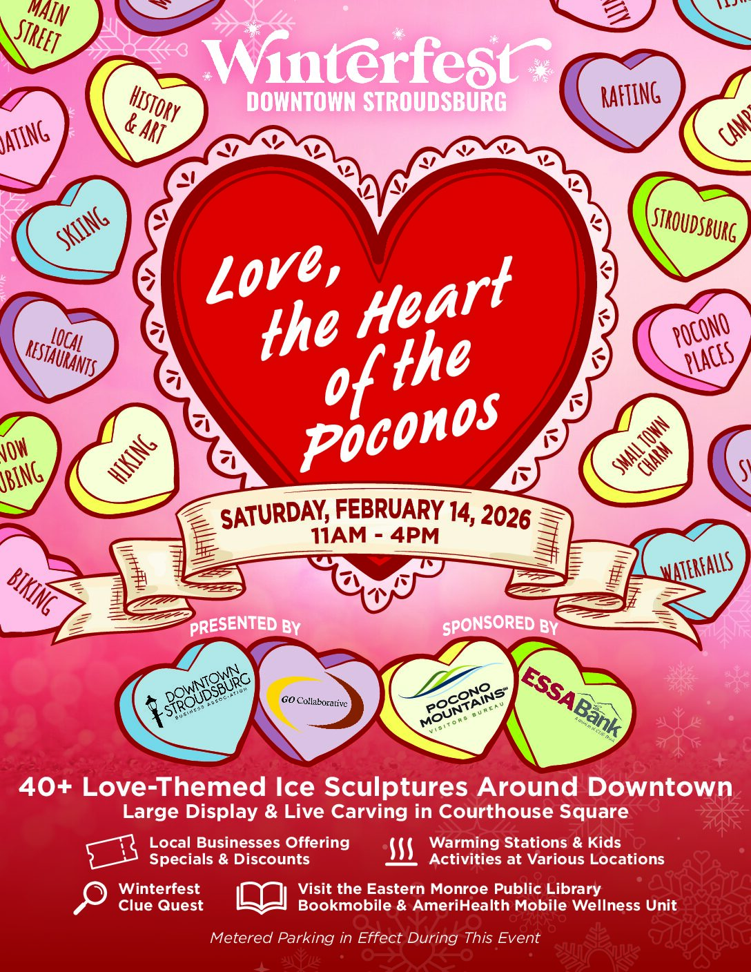 The GO Collaborative Presents WinterFest in Downtown Stroudsburg February 14th 2026 Winterfest 2026 mapWinterfest 2026 ParticipantsParticipant Business Specials Enjoy over 40 ice sculptures for this annual event with live ice carving in Courthouse Square at 11 am Ice Sculptures Of WinterFest Managed by: GO Collaborative